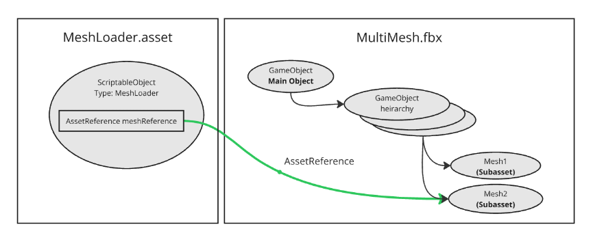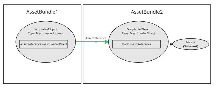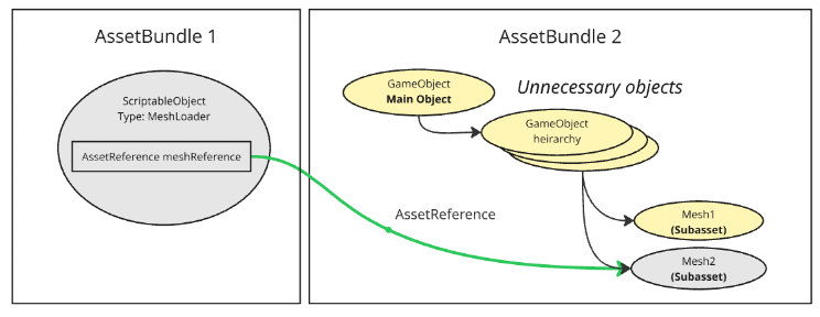 - AssetReference that references an intermediary asset: Only include the portion of the asset that is needed by the subasset. This requires an extra ScriptableObject to reference the subasset.