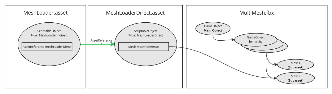 The second example shows how to include only a single Mesh in the build. This works by creating a "MeshLoaderDirect" ScriptableObject that directly references the Mesh subasset. The MeshLoaderDirect asset is explicitly assigned to a group, but the MultiMesh.fbx is not. Like the first approach, there's also a MeshLoader.asset in another AssetBundle. However, in this approach, the AssetReference points to the MeshLoaderDirect asset instead of directly to the Mesh.