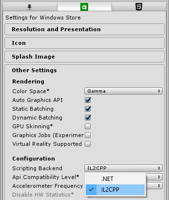 When building for Universal Windows Platform (UWP, formerly known as Windows Store Apps, WSA, or Metro), Bolt requires the use of the IL2CPP scripting backend. To change it, go to Edit > Project Settings > Player, choose the Window Store panel and change the value of the following dropdown:
