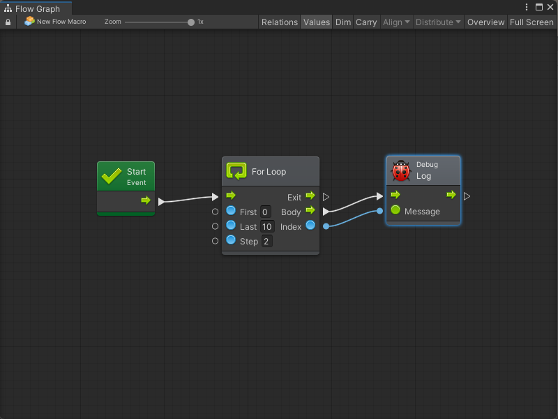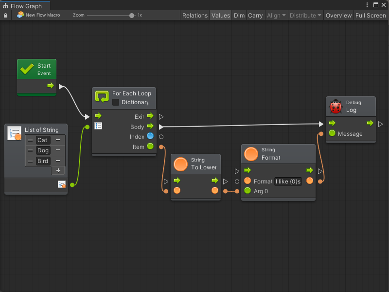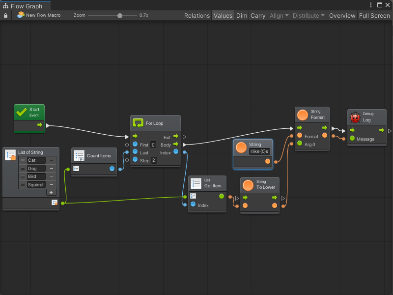 For example, this graph is very similar to the last, in that it will output I like {animal}s to the console. However, instead of using the for each unit that outputs each item, we get each item manually by its index in the list. This allows us to specify a different increment (in this case 2) and skip some items. Therefore, this graph will only output 2 messages: