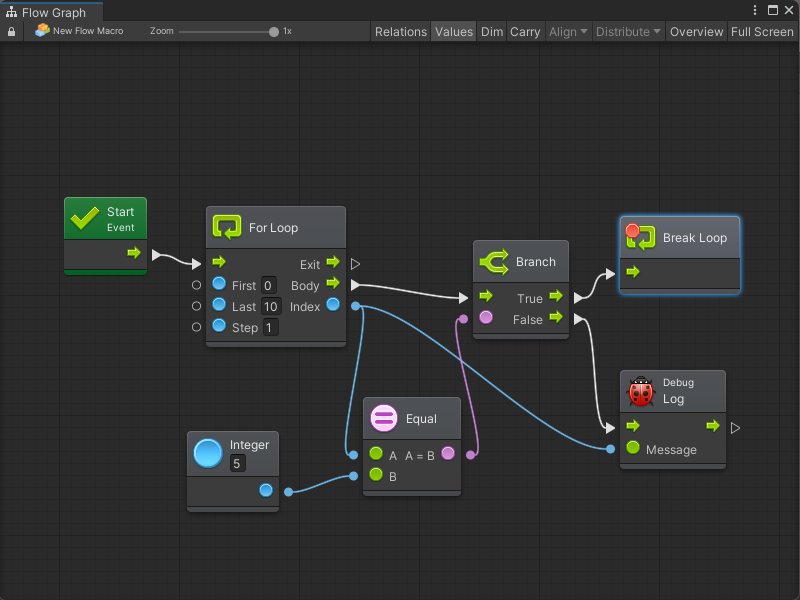 Be careful not to create an infinite loop! If the condition is always true, the editor will hang. Because loop bodies are synchronous, not parallel, there are few uses for while loops in Bolt.