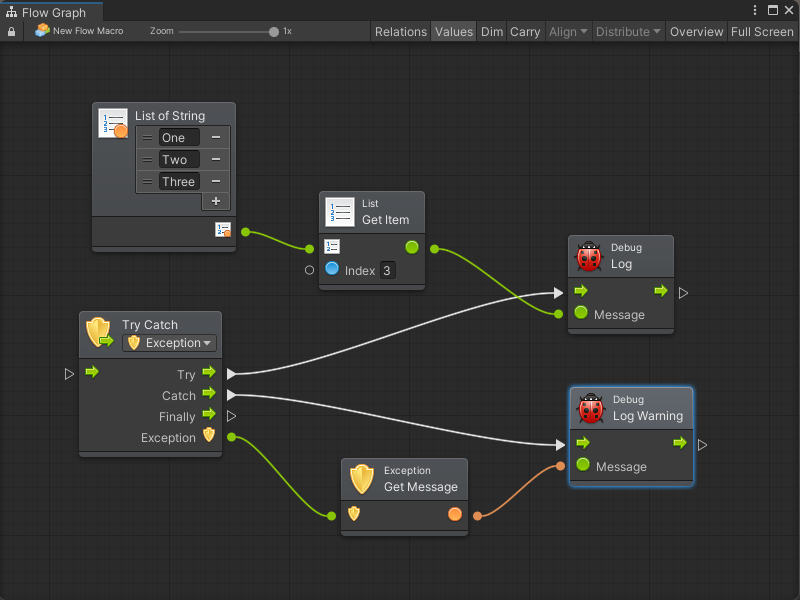 Anything that gets executed in the Try branch is considered "safe": if it fails, the flow will continue from the Catch branch instead. If that happens, the Exception port will contain information about the failure. A common way of handling it is to log a warning with the exception message, for example: