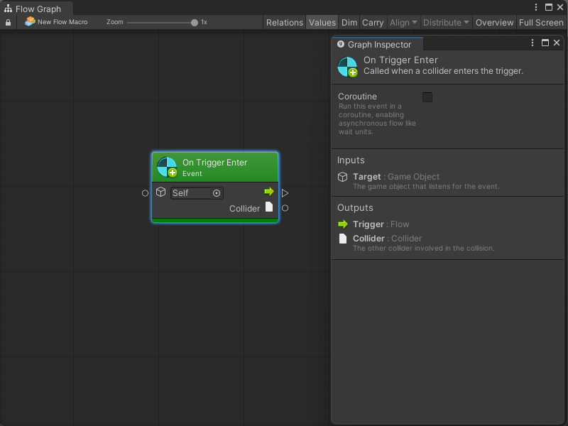 The value outputs on events are arguments that are passed from the event, giving you more information about what actually happened. For example, on the On Trigger Enter event, the other collider that was involved in the collision is an output: