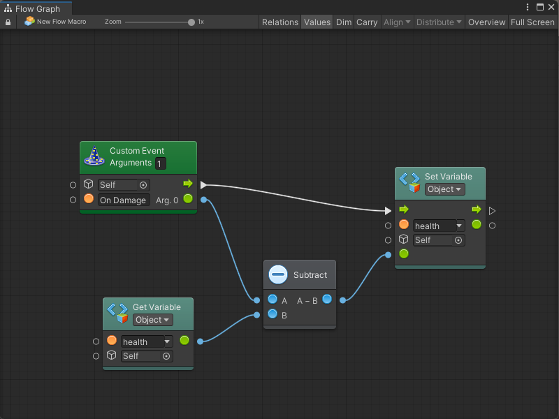 For example, if you were creating a flow machine on a boulder that could hit the player, you might want to use the force of the impact as the damage. Your trigger graph would therefore look something like this: