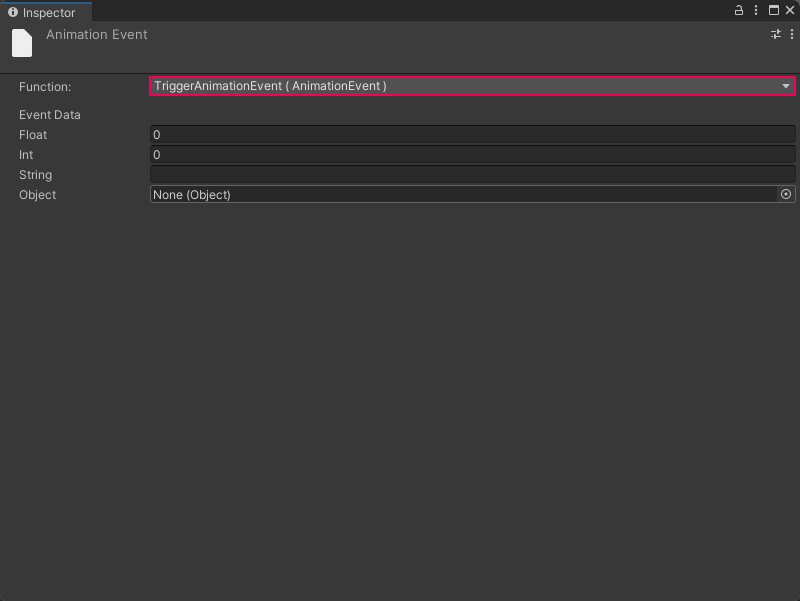 With the event selected, choose TriggerAnimationEvent as the function from the inspector: