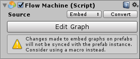 If you use a machine with an embed graph as a prefab, the edits you make on the prefab definition will not be automatically propagated to the prefab instances. Bolt will display warning messages in the inspector and in the graph window when you try to do this: