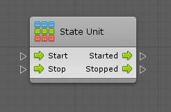 A state unit has two control input ports to indicate when to start and stop it, and two matching control output ports to specify what to do after.