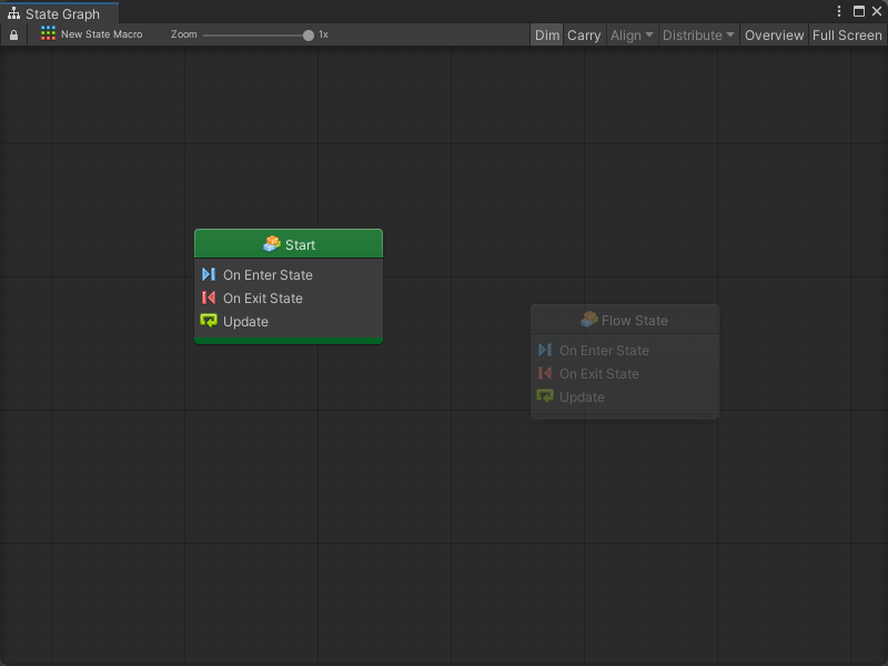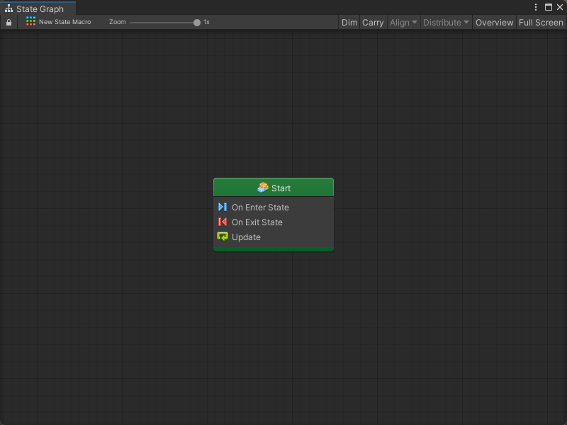 In the breadcrumbs at the top left, you can see that we are now within the state graph on our game object, inside the Start state. You can use this part of the toolbar to navigate back to parent graphs at any time.