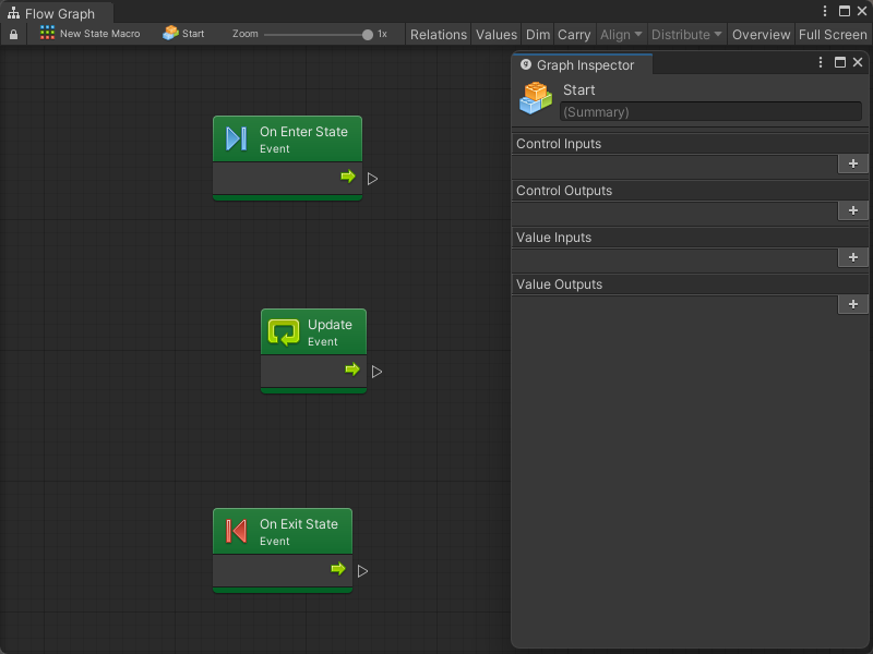Last but not least, the graph is pre-populated with 3 events. On Enter State gets called when an incoming transition leads to the parent state, and On Exit State gets called before the state is exited by one of its outgoing transitions. Update gets called at every frame while the state is active. Every event you add to a flow graph will only be listening while the parent state is active.