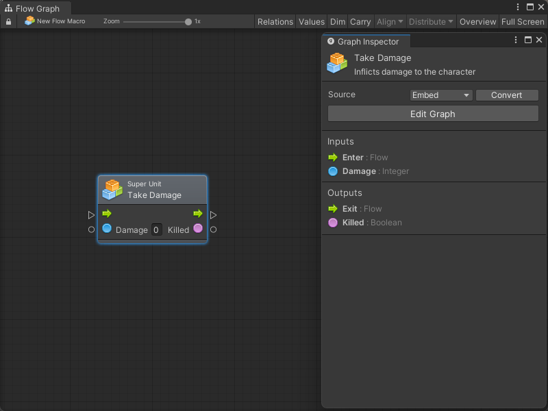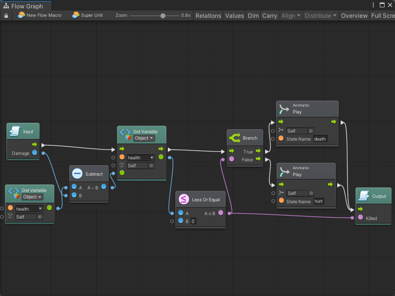 For this example, we'll create a Take Damage super unit. Its task will be to subtract the input damage from the health object variable, then check if it is below zero, in which case it should play a death animation. Then, it should return control to the parent unit and output a boolean that indicates whether the character was killed.
