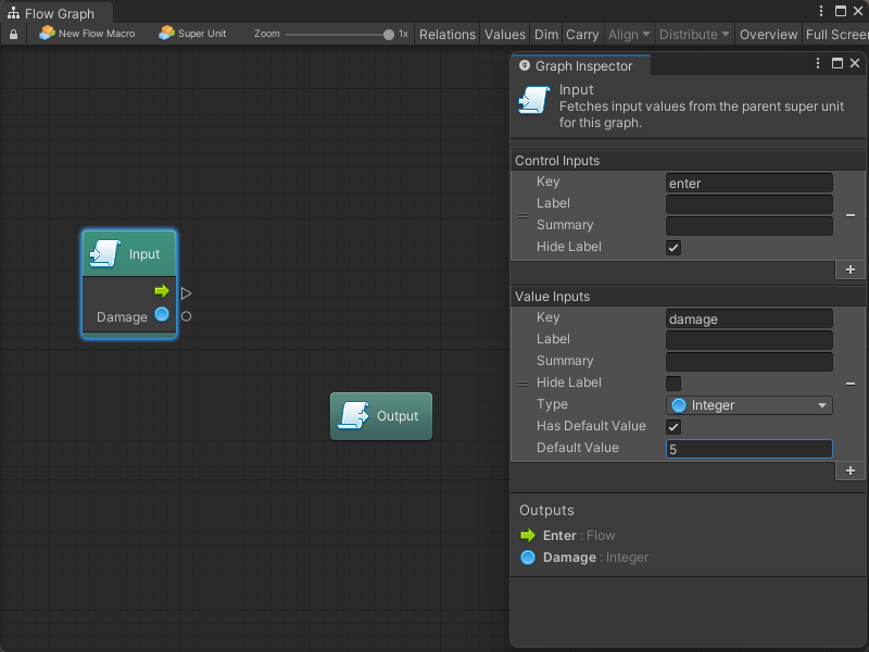 - The Input node allows you to define flow entry points and parameters of any type that should be passed to your super unit from the parent graph.
