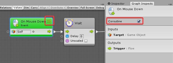 Asynchronicity (delayed execution) in Unity is handled by coroutines (not multithreading). This means we need to tell Bolt to run our flow as a coroutine in order to support wait units. Thankfully, all you have to do is enable the Coroutine checkbox on the initial event that starts the flow. You can do find it in the graph inspector: