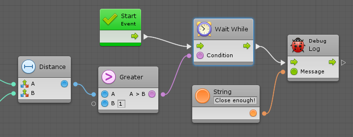 The Wait While unit is the opposite of the Wait Until unit: it stops execution as long as a given condition is met. For example, you could wait while an object is too far: