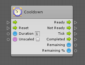 The Duration port determines how long it takes for the cooldown to become available again. Checking Unscaled will make it ignore the time scale.