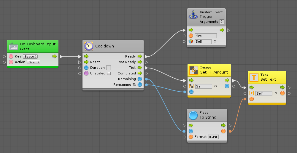 The Tick port gets called at every frame while a cooldown is active. It is a good place to update any GUI code that show an indicator of the remaining duration until the action can be called again. In order to get that value, you have two options: Remaining, which returns the number of seconds until ready, and Remaining %, which returns a value between 0 and 1, respectively from ready to not ready.