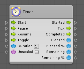 A timer is started by triggering the Start input, which will in turn trigger the Started output.