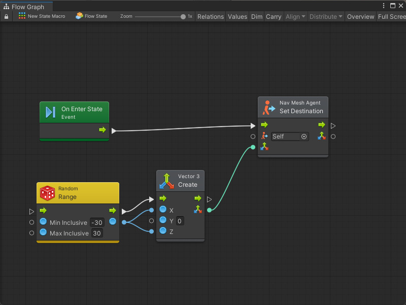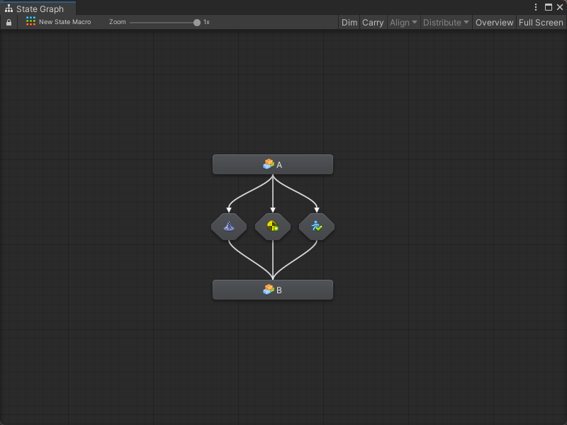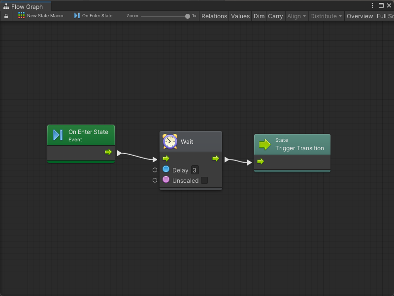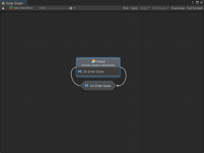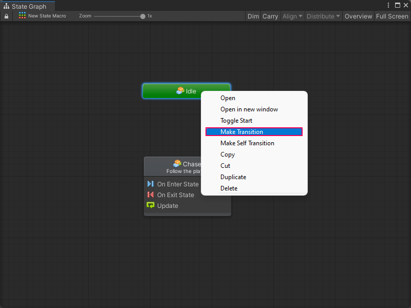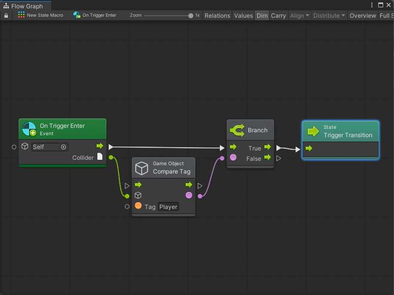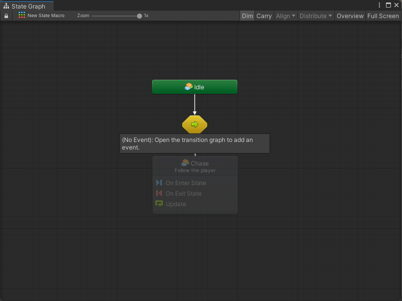 For example, if we want to transition to the chase state only when an object with the Player tag enters the trigger on the enemy, we could have a transition graph that looks like this: