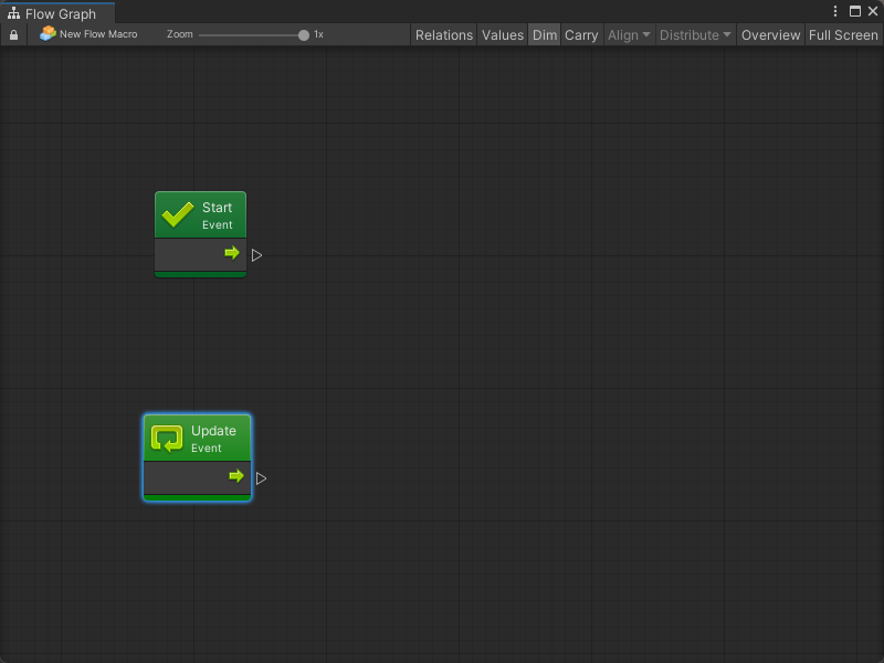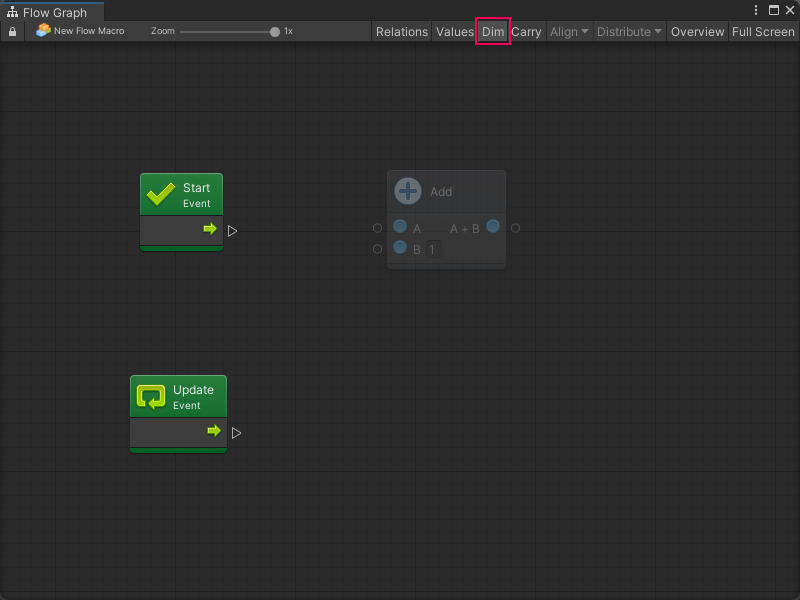 This is a very useful predictive debugging feature, but since we're not going to be connecting nodes until the next article, you might want to disable it to see what you're doing for now. You can toggle dimming with the Dim button in the toolbar: