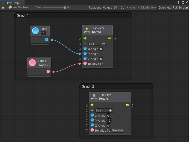 You'll have noticed by now that some value input ports have small fields next to them. These are called Inline Values. If the port is not connected, the value of this field will be used instead. Most common types support inline values, but not all types do. Inline values are useful to keep your graphs tidy by avoiding the creation of literal nodes for every value input port.