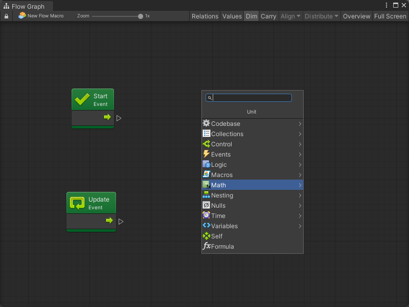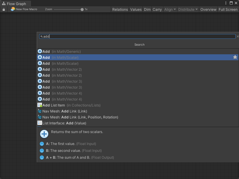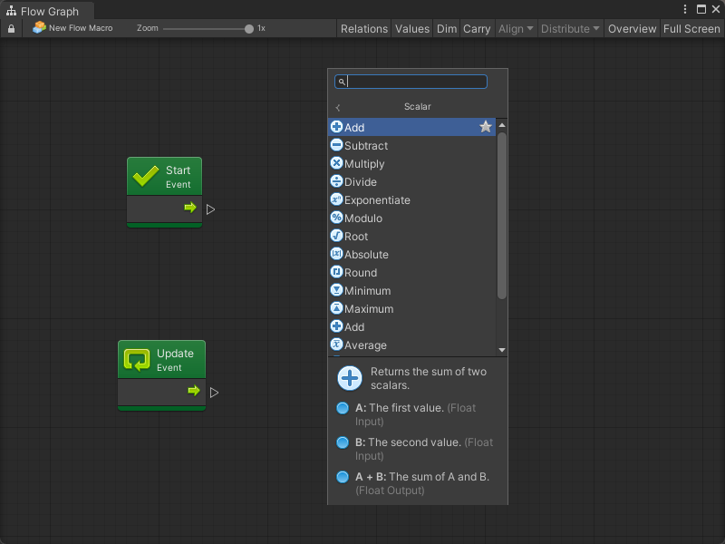 To display the fuzzy finder, simply right-click anywhere in the empty grid. You can then browse through the categories or search in the top field to quickly find a unit. Here, for example, we're adding a simple scalar addition (float + float) unit with both methods:
