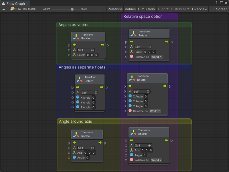 For example, the Rotate Transform unit has 6 overloads. Two of them take the angles as a single euler angle vector, two other take it as 3 separate float components in X / Y / Z, and the last two take it as an angle relative to the axis. In each pair, one allows to specify the relative space, while the other just assumes that you're specifying angles in world space. Here's a screenshot of all 6 overloads for the rotate unit: