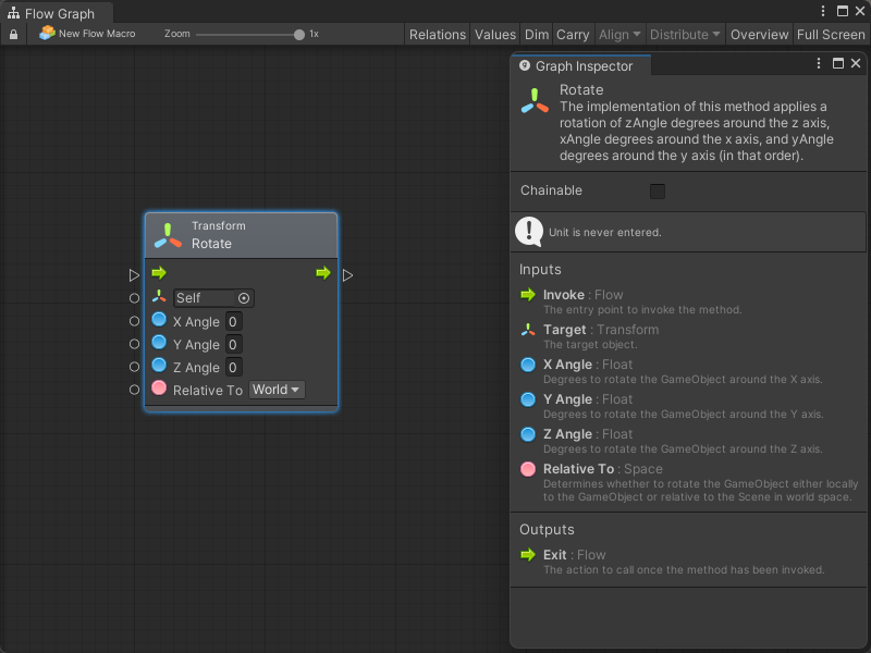 Let's look at the anatomy of a unit. In this example, we created a Rotate Transform unit, which you can find under Codebase > Unity Engine > Transform > Rotate (X, Y, Z, Relative To)