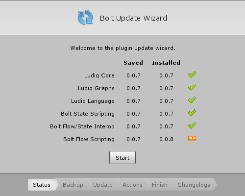 Once a new version has been downloaded and imported from the asset store, the update wizard should automatically open. If not, you can open it manually via Tools > Bolt > Update Wizard....