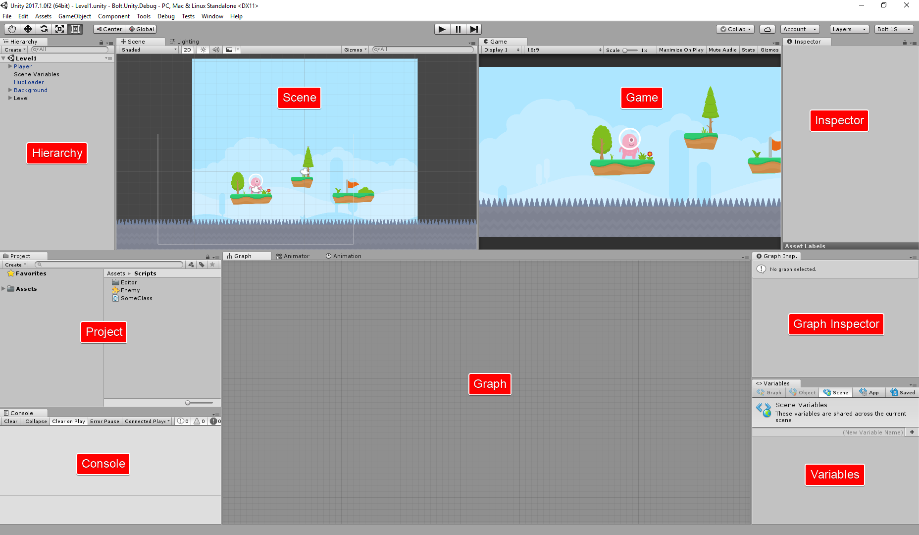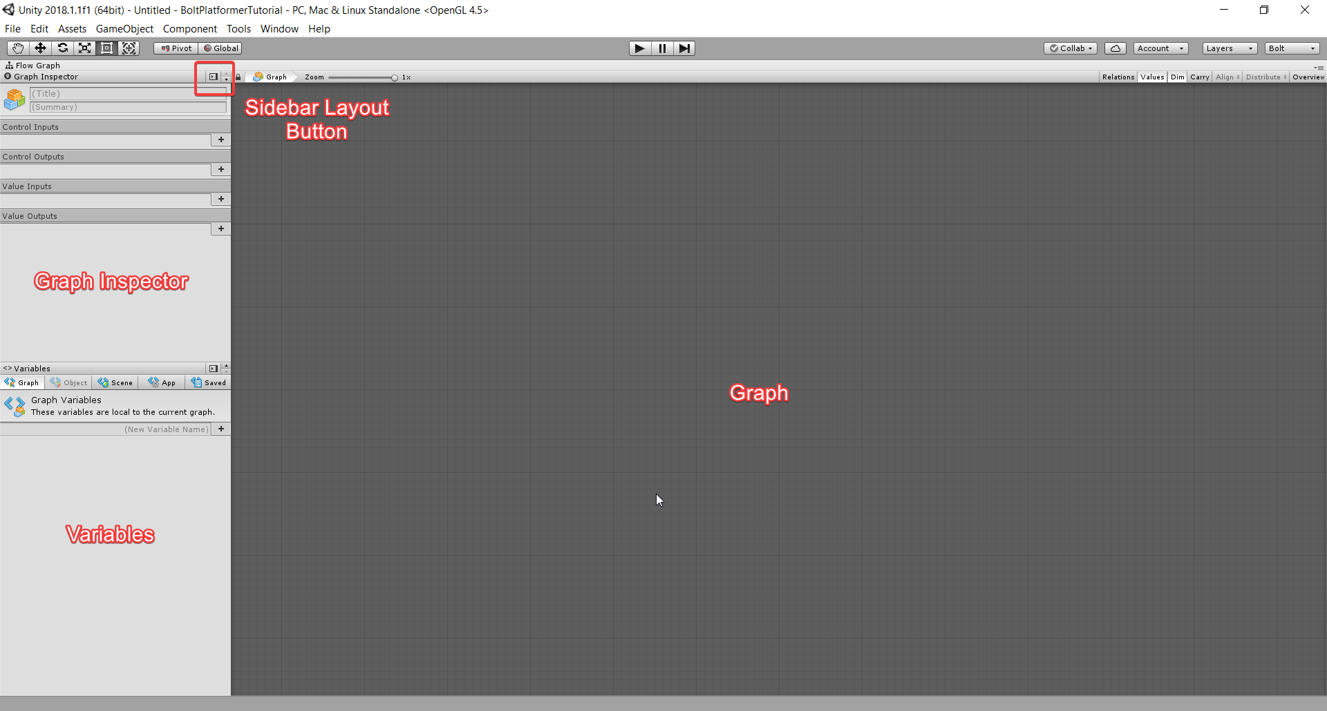 Note: If you have dual monitors, you may want to put Bolt on your second monitor entirely. This gives you a lot of room for graph editing and keeps your usual Unity layout intact. The window will automatically detect that it has enough space to display the sidebars.