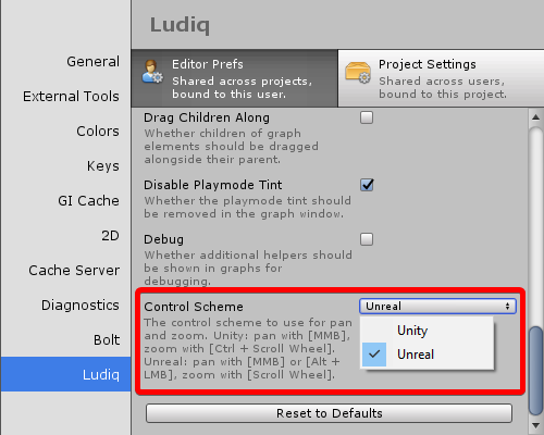 When in the graph window, there are two Control Schemesthat determine how to pan and zoom. You can configure your control scheme in Edit > Preferences > BoltEx. By default, it is set to Unreal.