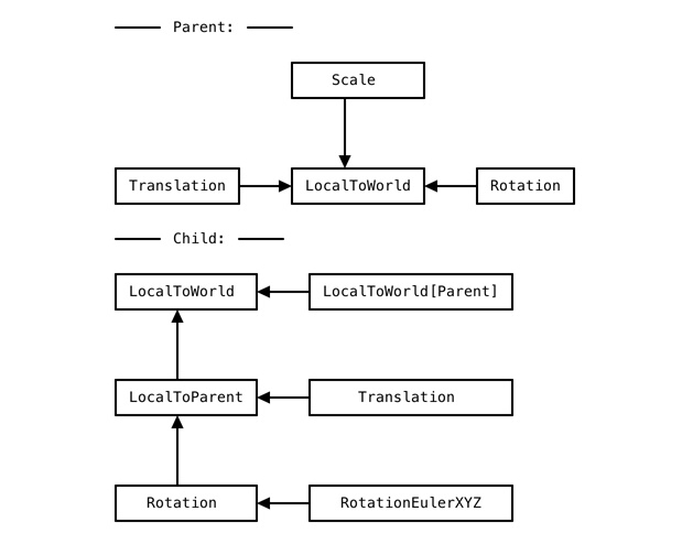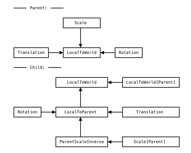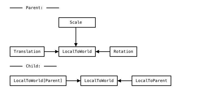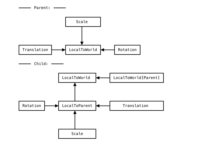 - [LocalToParentSystem] Child: Write LocalToWorld <= LocalToWorld[Parent] * LocalToParent