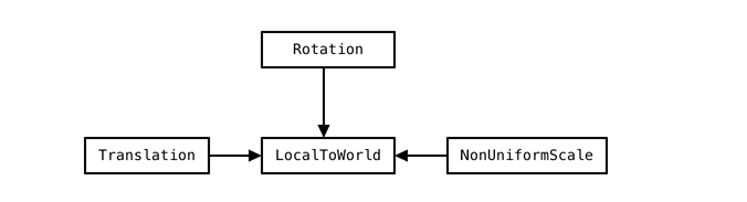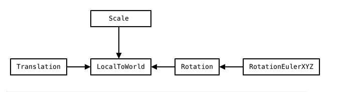 If any combination of Translation (float3), Rotation (quaternion), or Scale (float) components are present along with a LocalToWorld component, a transform system will combine those components and write to LocalToWorld.