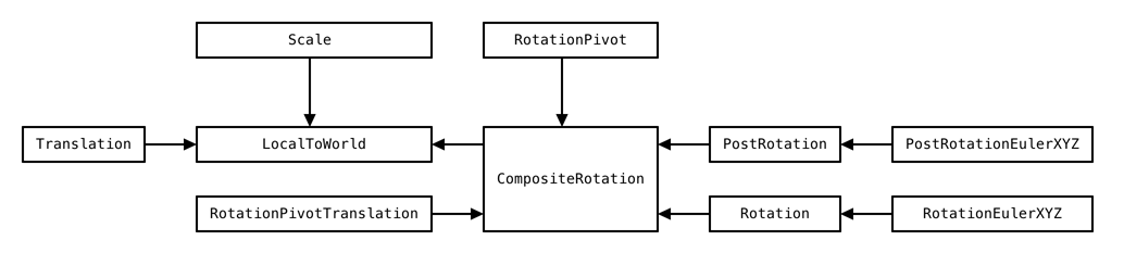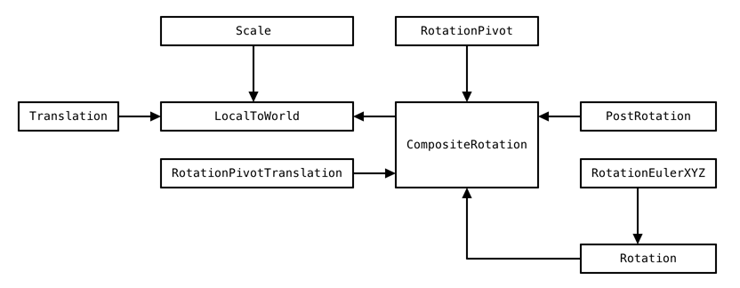 If any combination of Translation (float3), Rotation (quaternion), or Scale (float) components are present along with a LocalToParent component, a transform system will combine those components and write to LocalToParent.
