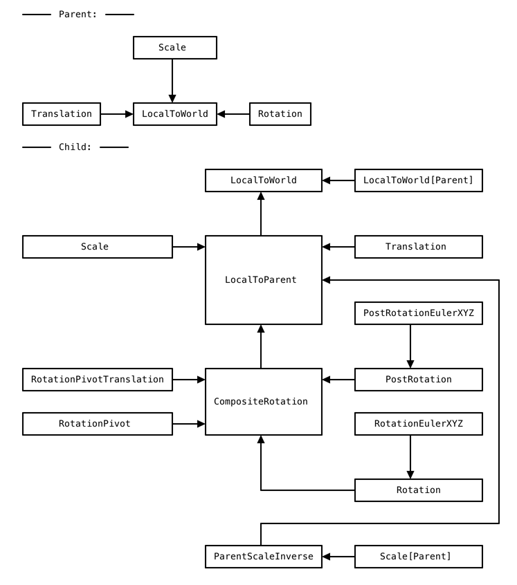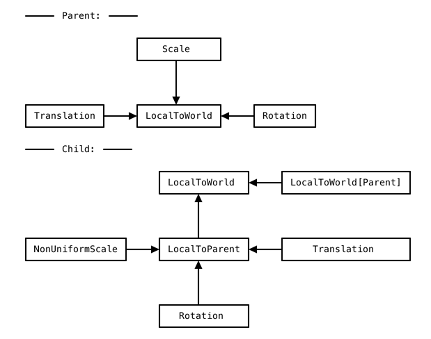 LocalToWorld components associated with Parent Entity IDs are guaranteed to be computed before multiplies with LocalToParent associated with Child Entity ID.