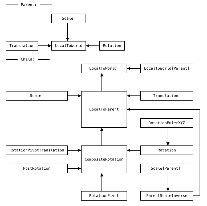 - [LocalToParentSystem] Parent: Write LocalToWorld <= LocalToWorld[Parent] * LocalToParent