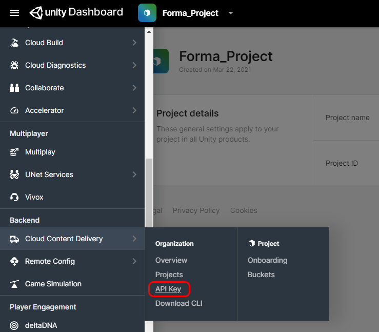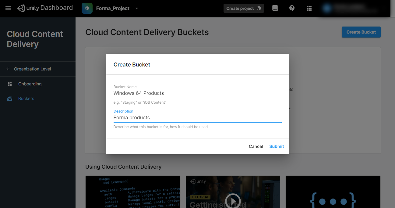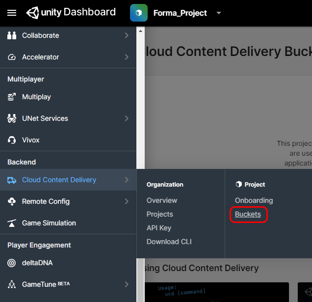 - From your Unity Cloud Content Delivery dashboard, select the Project you want to use (or add a new one).