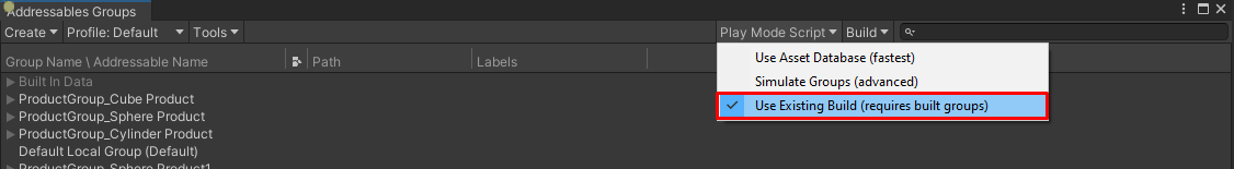 Play Mode Script in the Addressable Groups Window to Use Existing Build.