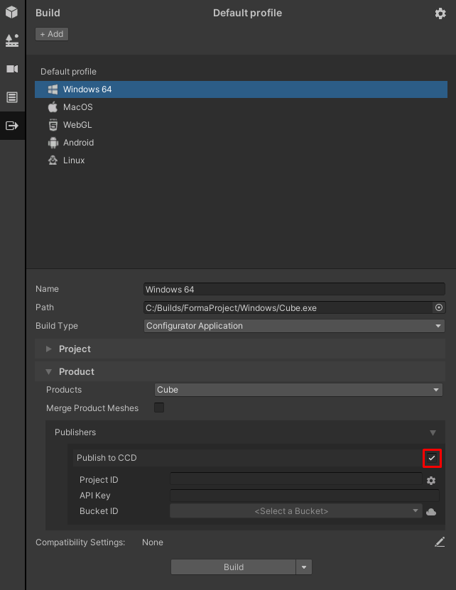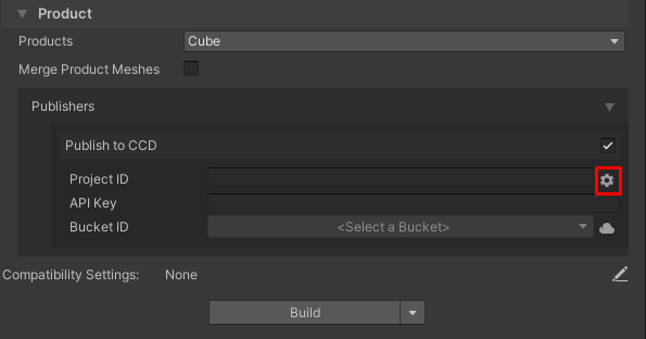 - Select the Publish to CCD checkbox. Other options for setting up export to Unity Cloud Content Delivery appear.