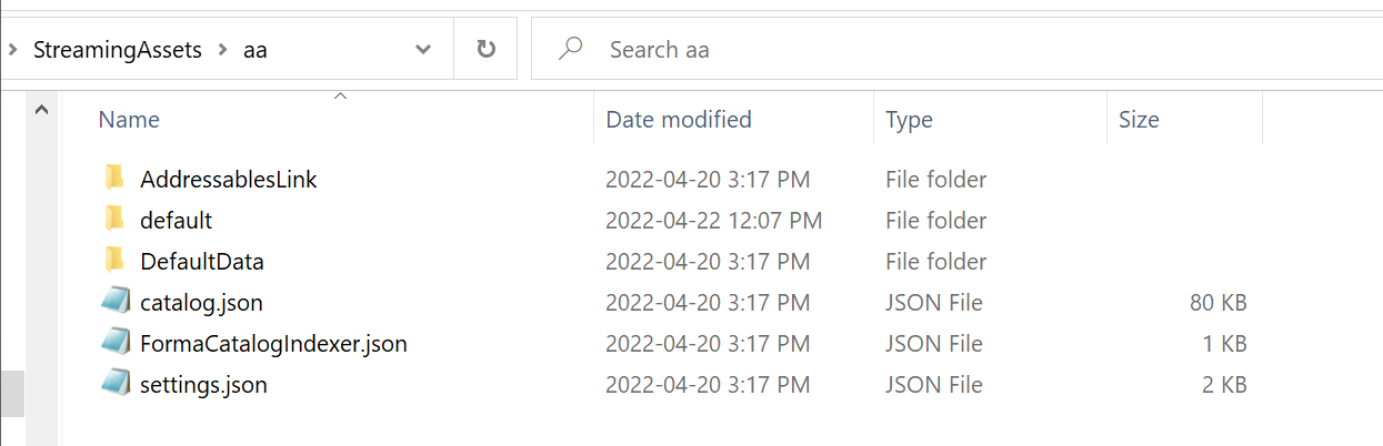 AddressablesLinkis used for code stripping by the addressable package (not required at runtime).defaultcontains your product builds catalogs and asset bundles (this data can be moved to a remote server).DefaultDatacontains theDefault Local Groupdata and users' custom addressable data.catalog.jsonandsettings.jsonare generated by the addressable assets system and needed for the runtime to work (this should always stay in theStreamingAssetfolder)FormaCatalogIndexer.jsoncontains the relative paths to the catalogs subfolder (for example:defaultandDefaultData). File detection is not always possible oniOS,AndroidorCCDso Forma uses this file for data discovery.