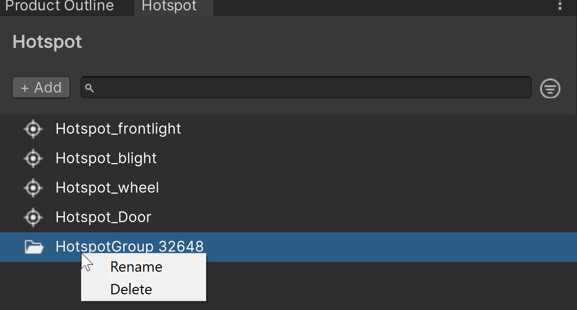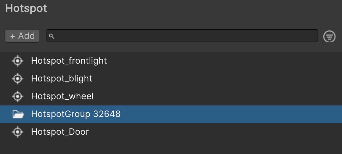You can create groups of tiered Hotspots for the different details of a single Product part. For example, a Hotspot Group for a car door might include different Hotspots for the door handle, driver door controls, and apholstery.