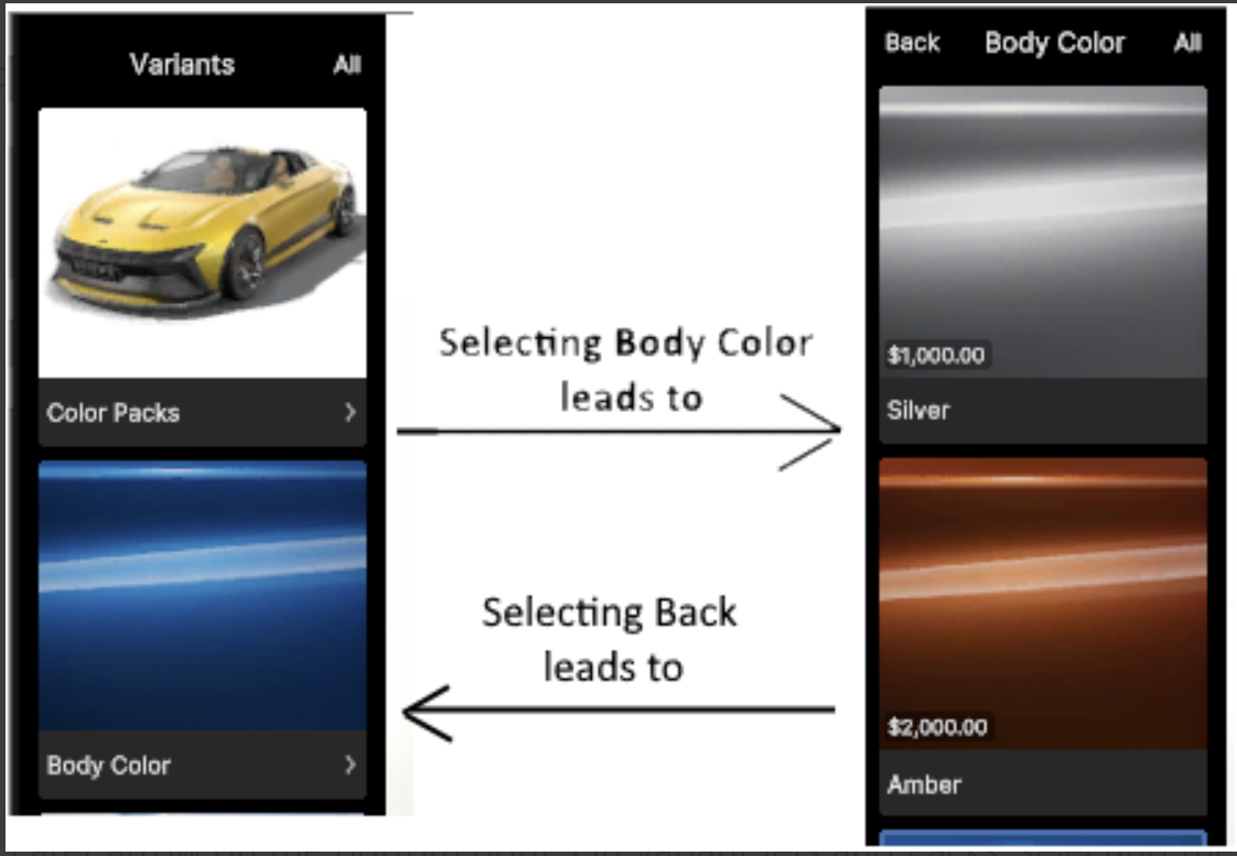The StandardUI GameObject gets data from the different tabs of the Configurator window. Variants and the UI data associated with them is authored in the Variant Table (in the Product Setup tab of the Unity Forma Editor interface).