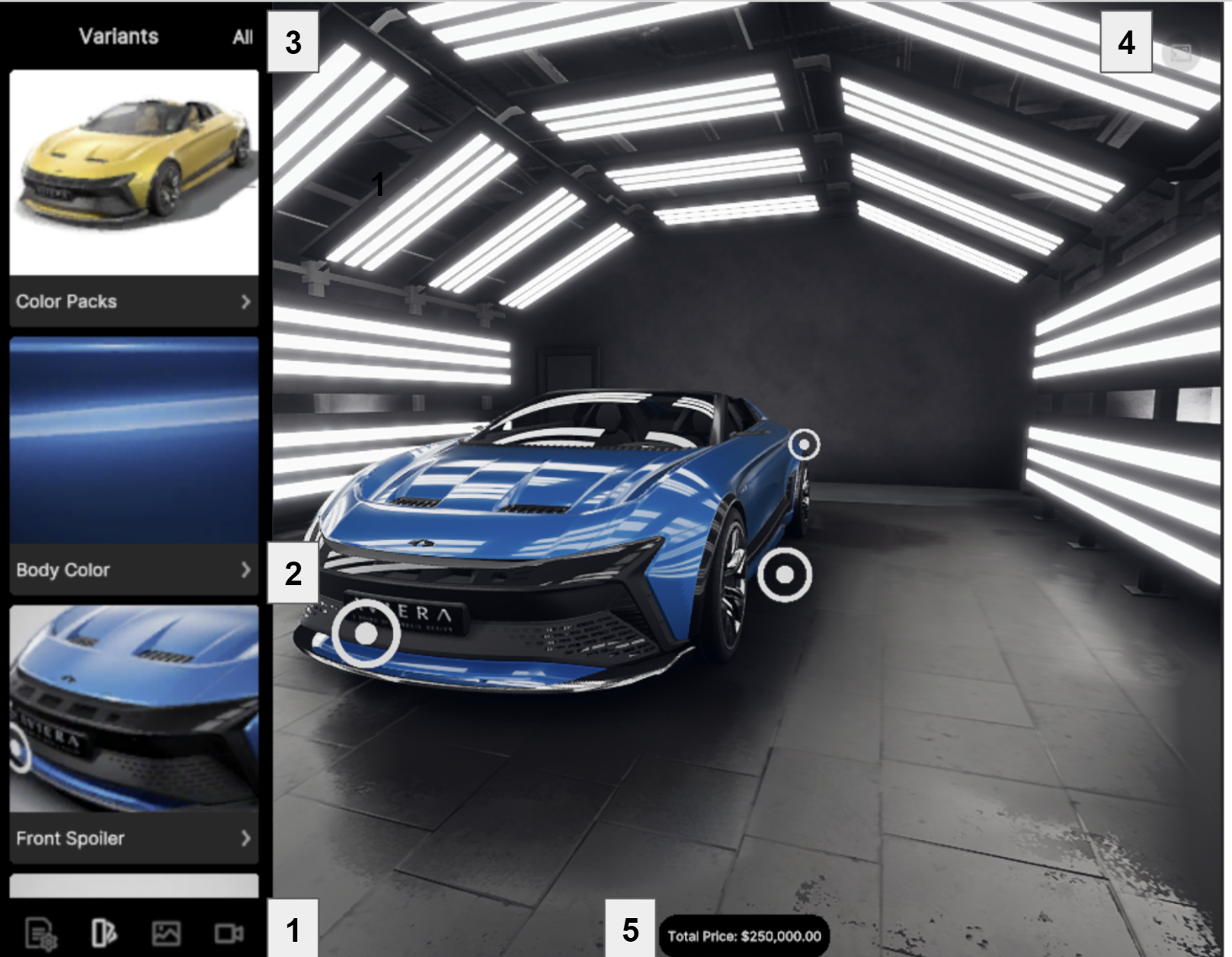 Displays the total price of the product with the users' selections. You can disable the Total price display from the Configurator GameObject in the Unity Editor.