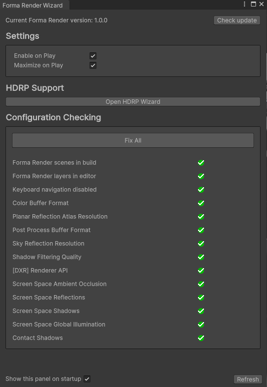 Before you export your Forma Render application from Unity Forma, you must make sure that your Project settings support high quality rendering. When you install the Forma Render package in Unity Forma, a wizard automatically verifies your Project settings.
