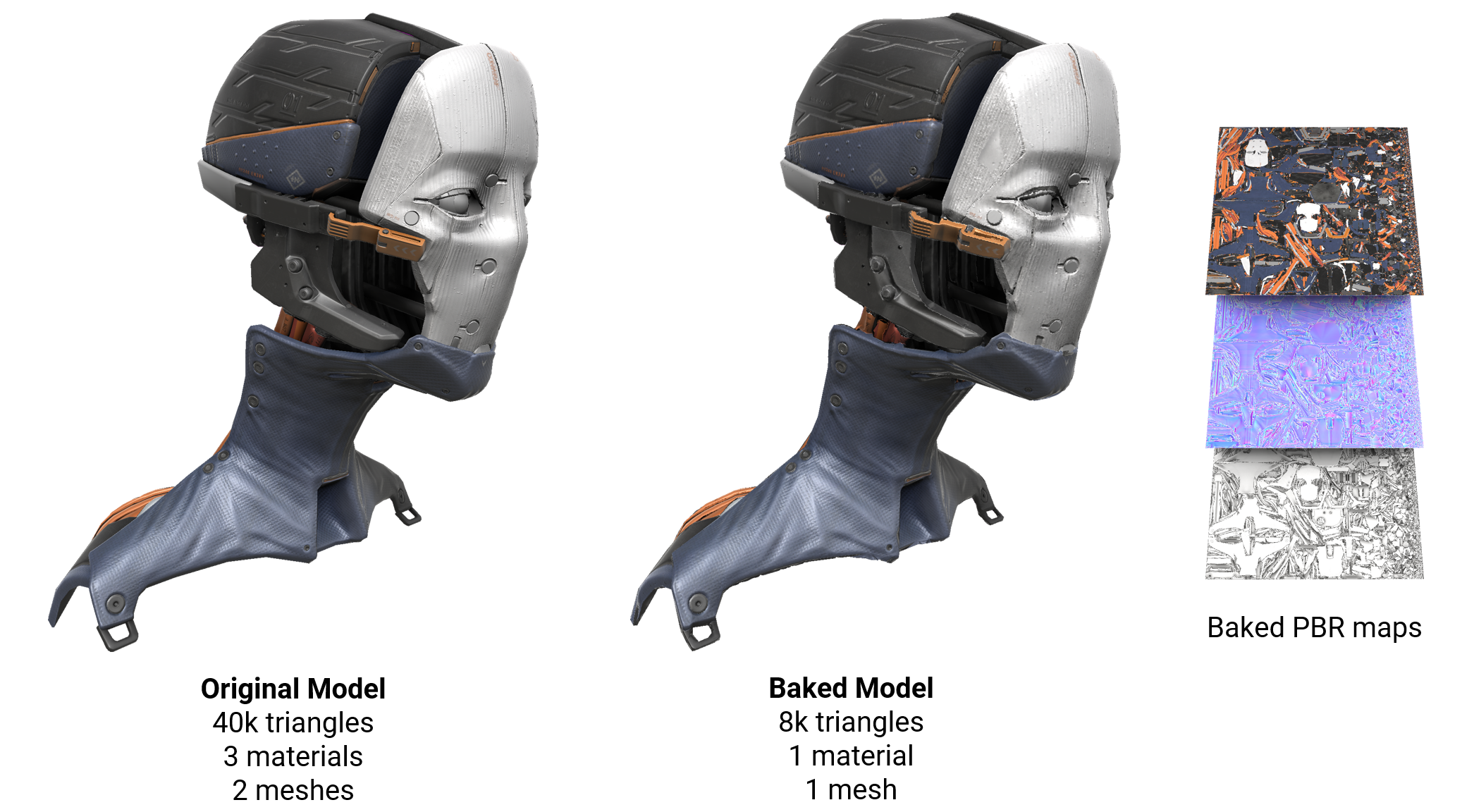 Among other optimization techniques such as triangle count reduction, Asset Transformer Toolkit supports material baking which is the process of combining multiple materials into one low-resolution material applied on an automatically packed UV mesh.