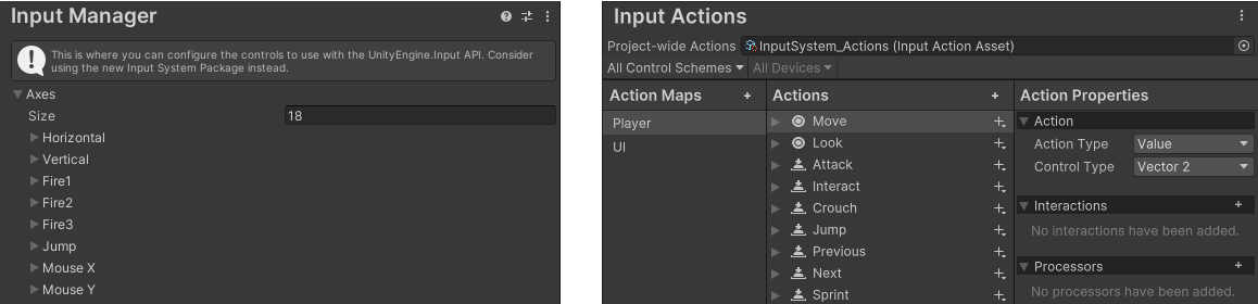On the left, the old Input Manager Axes Configuration window, in Project settings. On the right, the new Input System's Actions Editor.