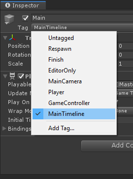 To tag a Game Object, select it and choose MainTimeline in the list of tags
