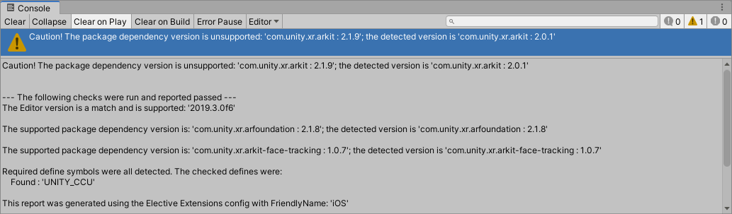 Elective Extensions runs when building for a configured build target (currently Android, iOS, and Lumin) and checks against a known good list of settings and package versions.