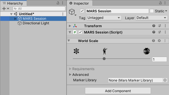 Unity MARS uses a concept called World Scale that allows you to develop content at real-world scale, and display it at a miniature scale. You can adjust the World Scale for the current Scene in the MARS Session Inspector. In general, MARS uses a scale of 1:1 for life-sized AR and 1:10 for tabletop miniatures.
