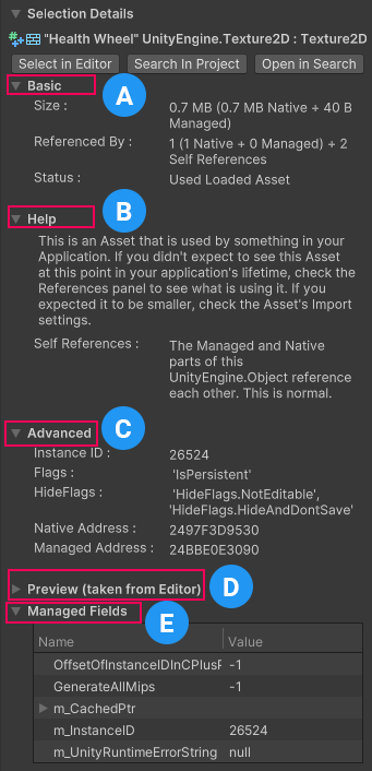 - The Size entry displays the size of the object in memory, and how much of that total is native or managed memory.