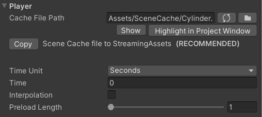 Copying the cache file to StreamingAssets is recommended, and can be done by simply clicking the Copy button.Playing .sc files located in folders outside the active Unity project is supported, but keep in mind that only the computer which stores those .sc files can play them.