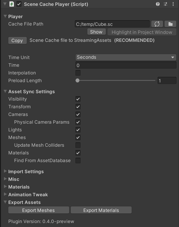 Copying the cache file to StreamingAssets is recommended, and can be done by simply clicking the Copy button.Playing .sc files located in folders outside the active Unity project is supported, but keep in mind that only the computer which stores those .sc files can play them.